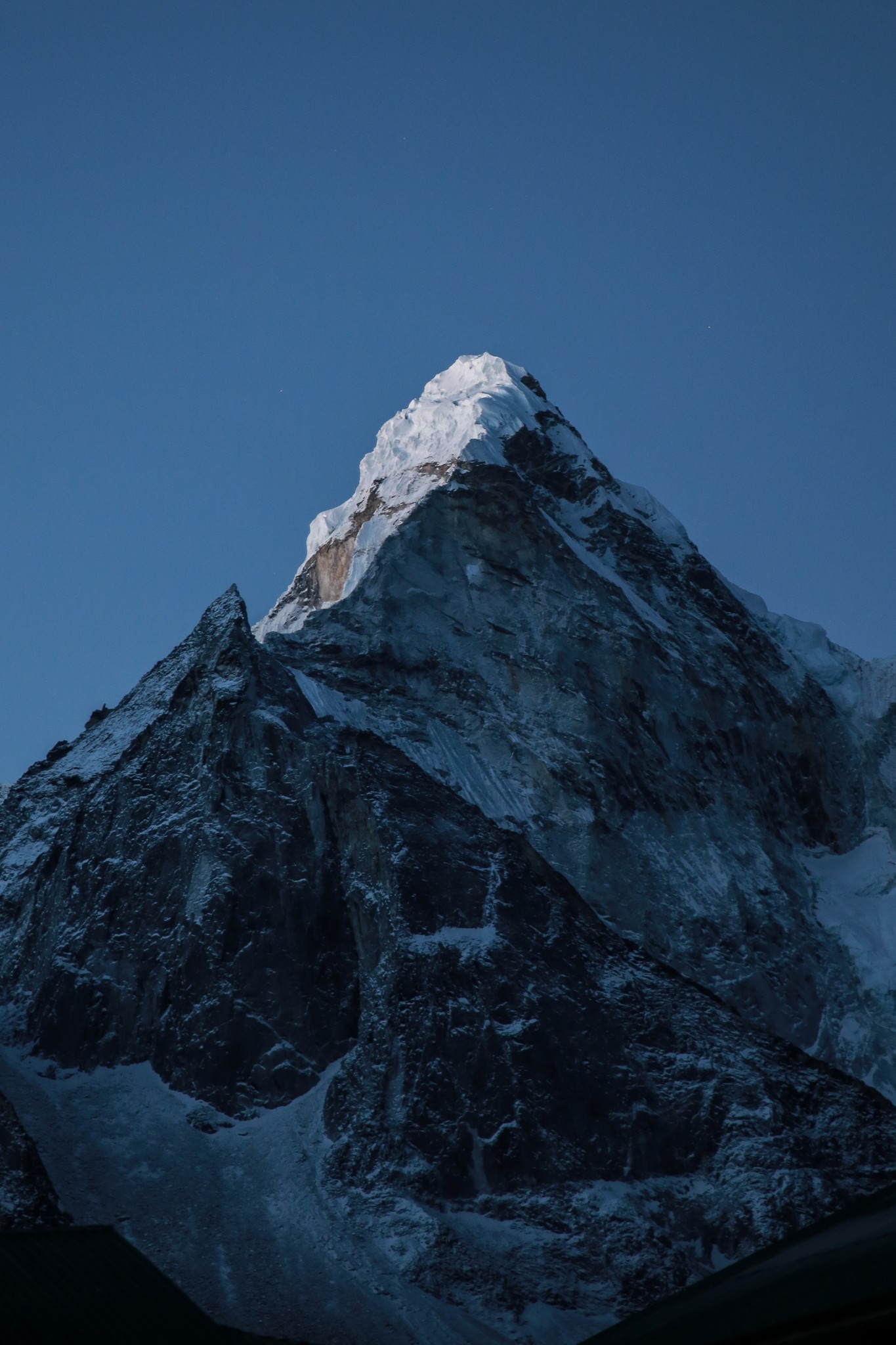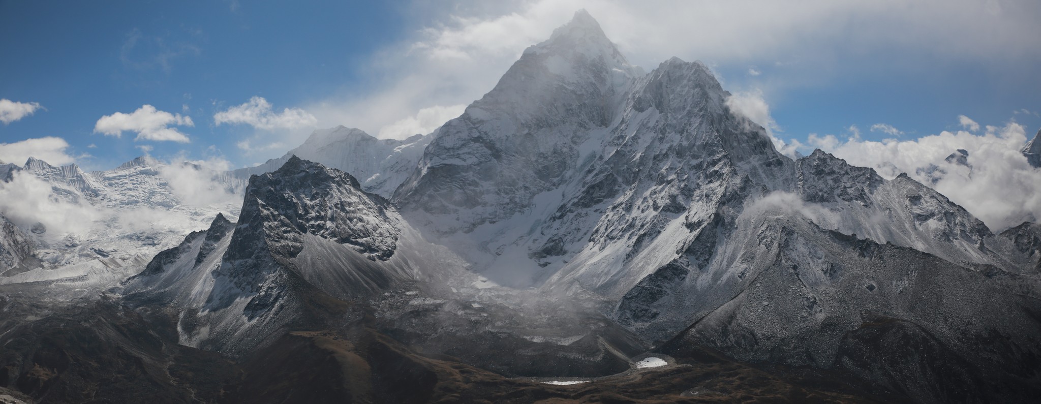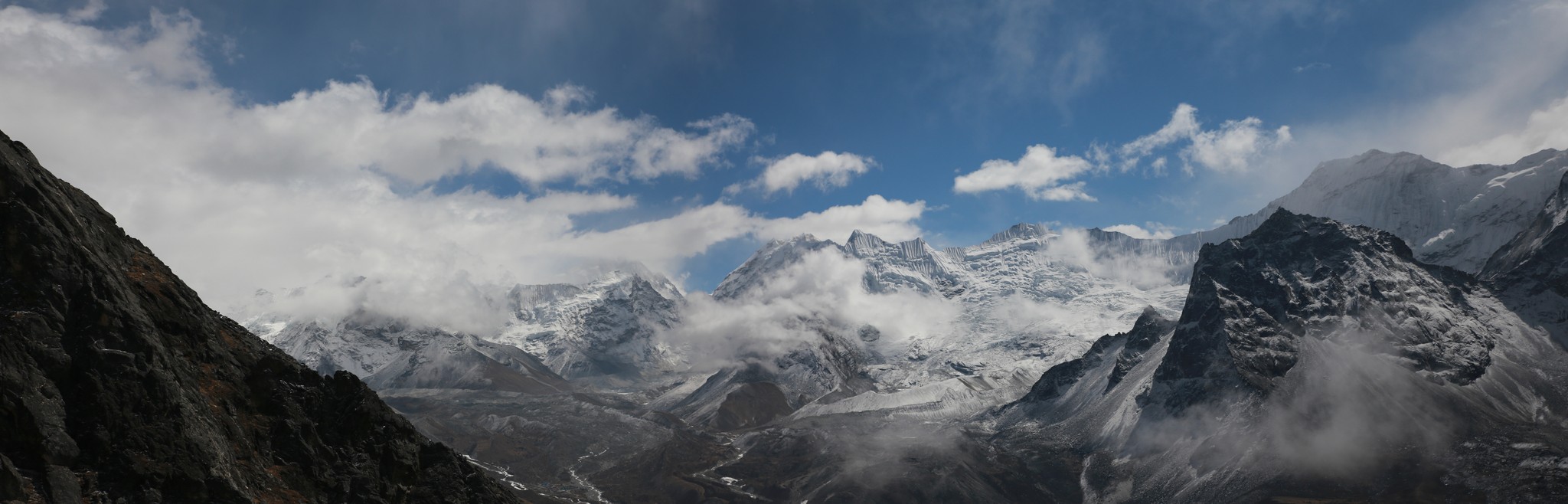 La nuit a été encore plus fraîche, le temps paraît un peu couvert. Un peu decu je passe rapidement l’épreuve qui consiste à poser son pijama (collant et manches langues termique àvec polaire, le tout dans le sac de couchage sous deux couvertures) et à renfiler les affaires de marche. Je rejoins les autres dans la salle principale pour le pti dej (souvent pancake au miel avec un grand café) et peu de temps après le soleil se lève et traverse les nuages, la tempête a laissé 4-5cm de neige et àvec le soleil les couleurs sont magnifiques ! On part donc dans la neige fraîche pour la ballade de la journee, rejoindre Dingboche à 4100m, environ 6h de marche au programme. Le sentier est encore plus beau que la veille, on avance de quelques kilomètres puis on traverse la rivière et soudain tout le monde se fige, on est tout près de l’Ama Dablam, il se dresse juste devant nous, magique. On avance dans sa direction pendnant presque toute la marche. Le temps est beau et chaud, on marche en t-shirt pendant un moment, superbe lunch de saucisson fromage devant la belle montagne avant de finalement arriver à Dingboche qui est vraiment au pied de l’Ama Dablam, hélas maintenant dans les nuages il faudra attendre le lendemain pour le revoir.