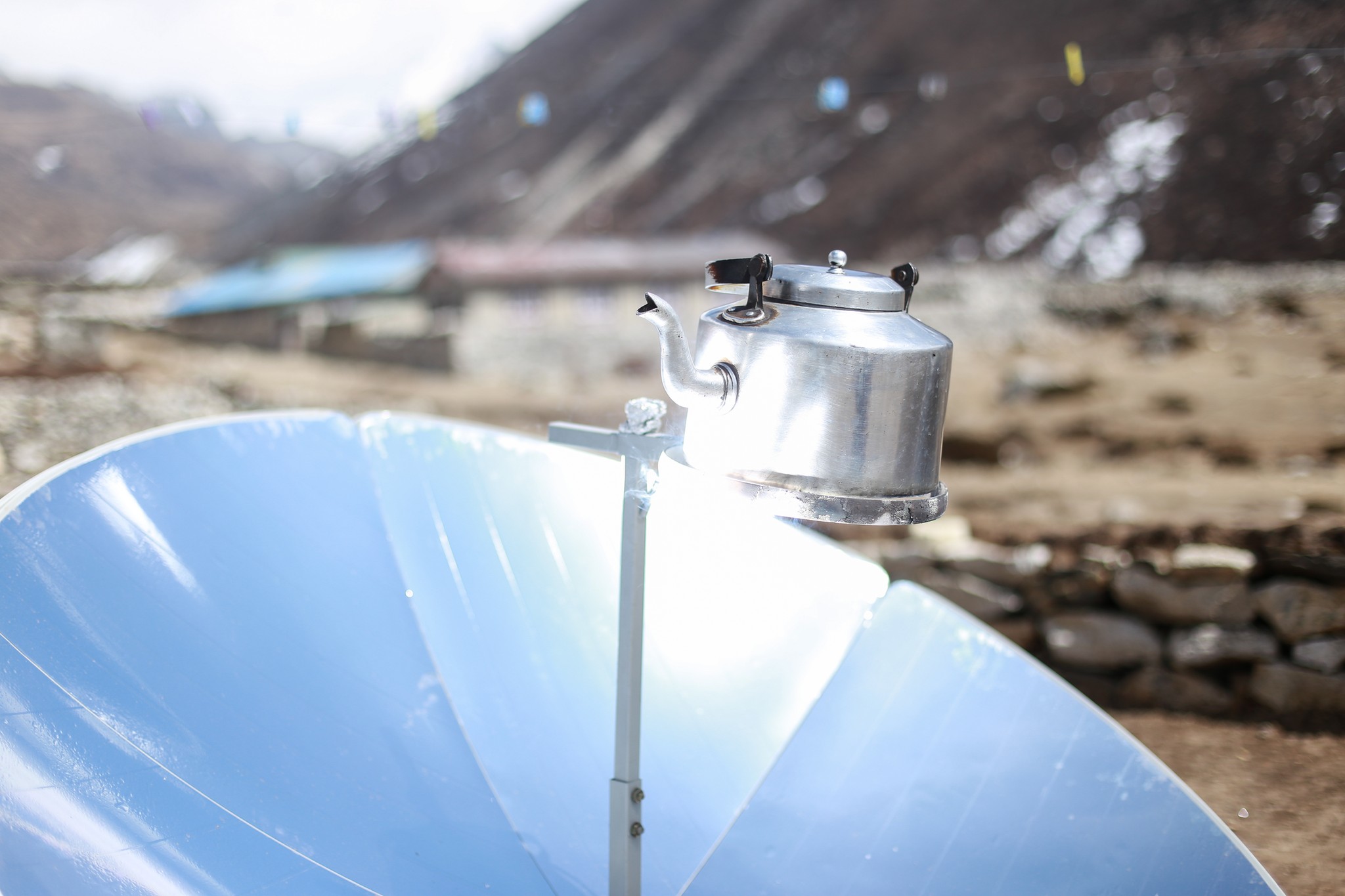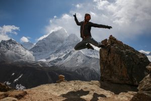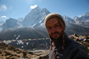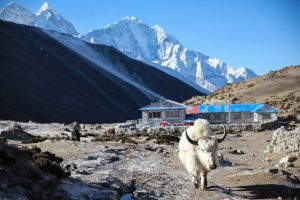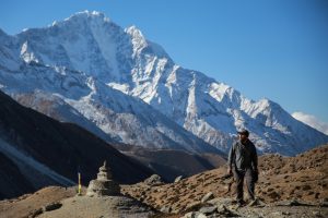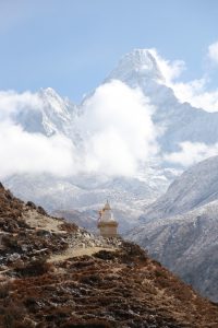L’idée étant toujours de monter plus haut que là où on dort on part avec Victor (un américain qui a énormément voyagé avec qui je marche depuis la veille) jusqu’à un temple 300m plus haut derrière le village. Ici l’altitude commence à se faire sentir et on avance doucement sur le sentier raide. La situation de Dingboche est vraiment belle, au cœur des montagnes. Au loin on peut apercevoir Chukkung, ma prochaine etape, avec derrière l’Island Peak, un 6200m que je comptais faire mais que je garde finalement pour la prochaine fois pour des raisons de permis.