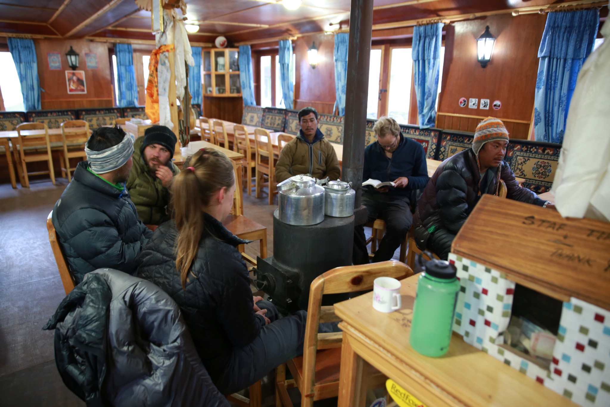Comme d’habitude vers 16-17h on se redirige vers le Lodge afin de commander le dîner qui sera servi vers 19h, après avoir bien bavardé vers 19h30 20h les gens filent se coucher, le froid règne, la fatigue aussi et la nuit s’annonce froide, d’ailleurs l’eau est gelée dans les toilettes… Aller vite, dans le sac de couchage !