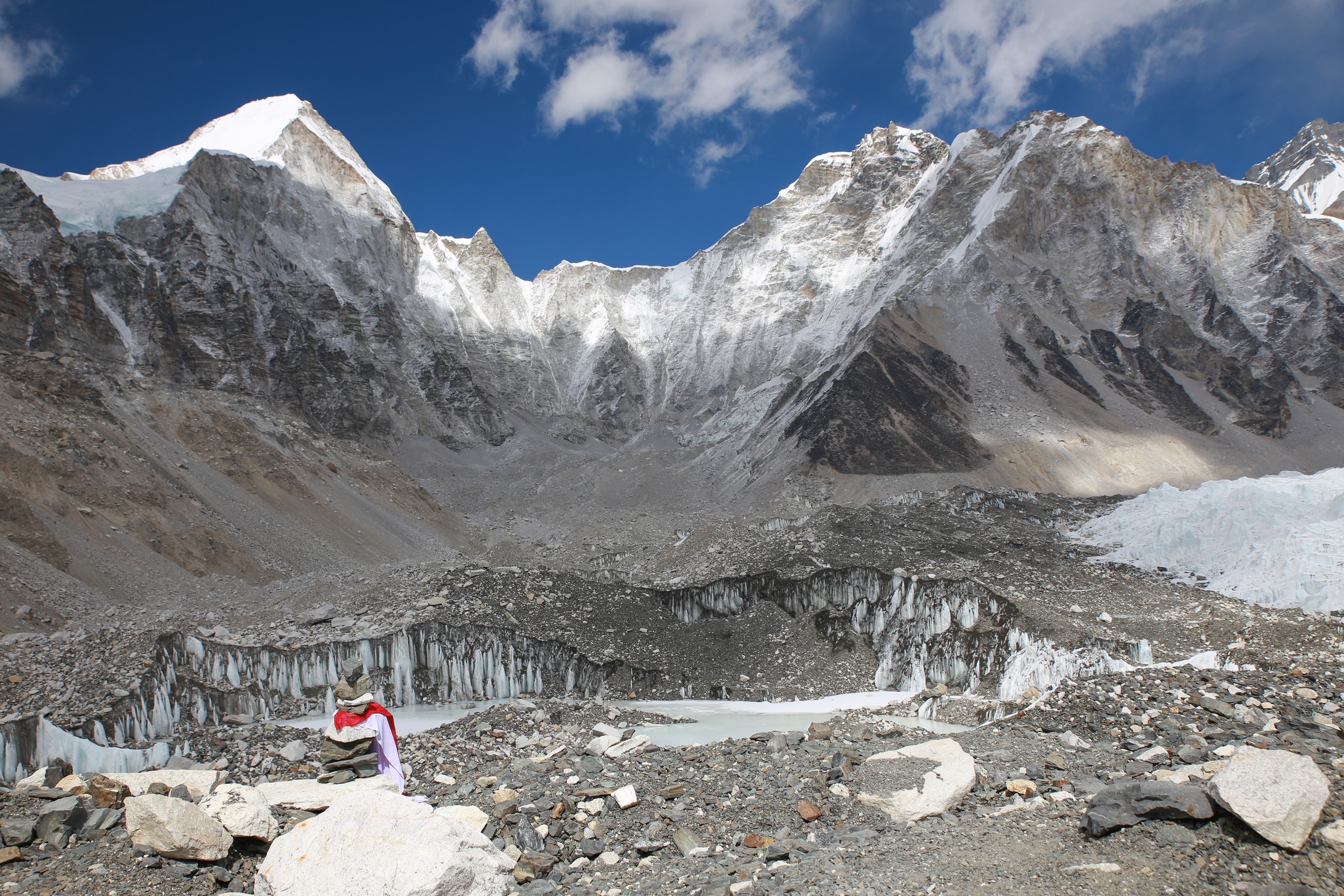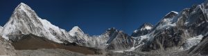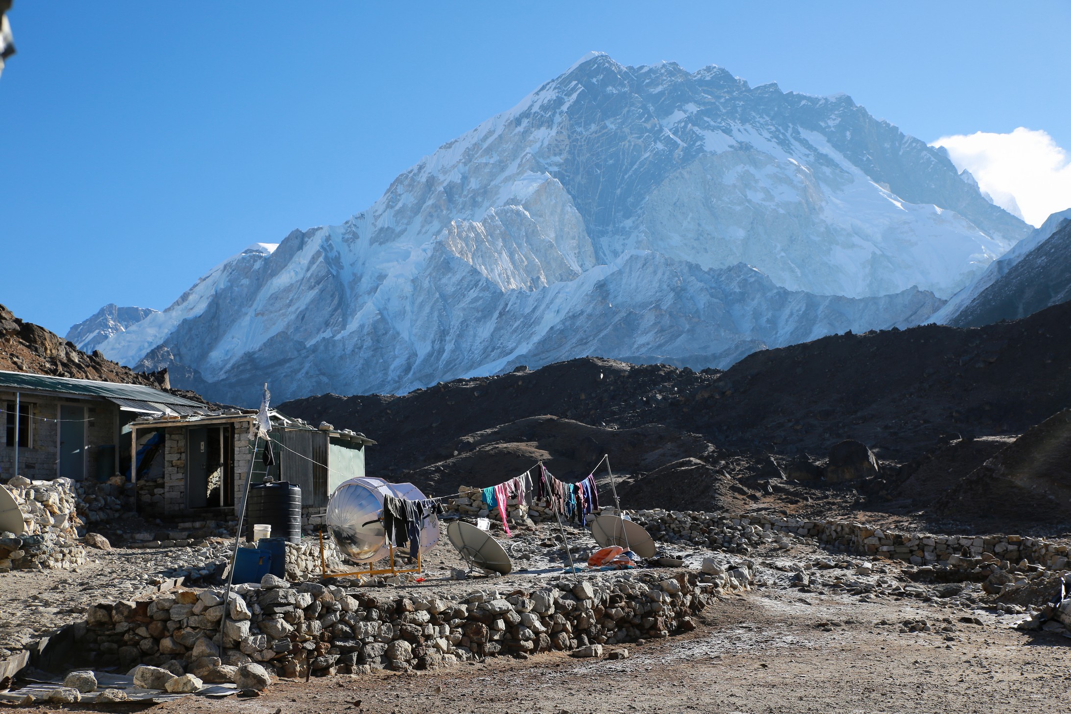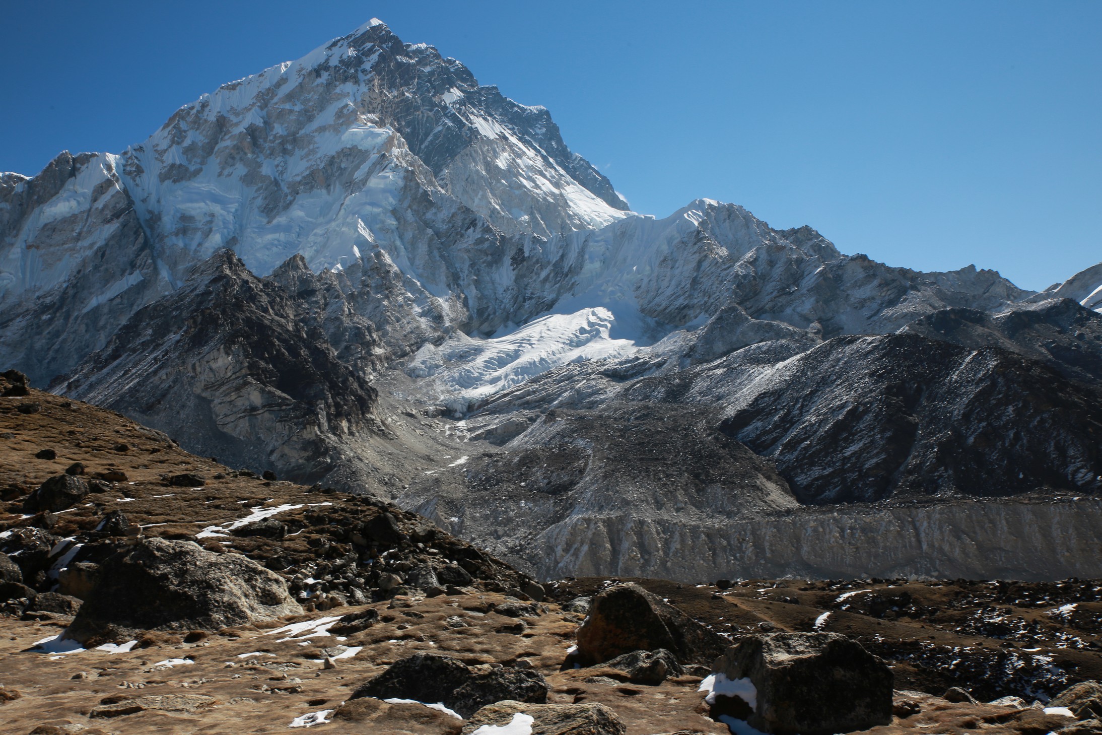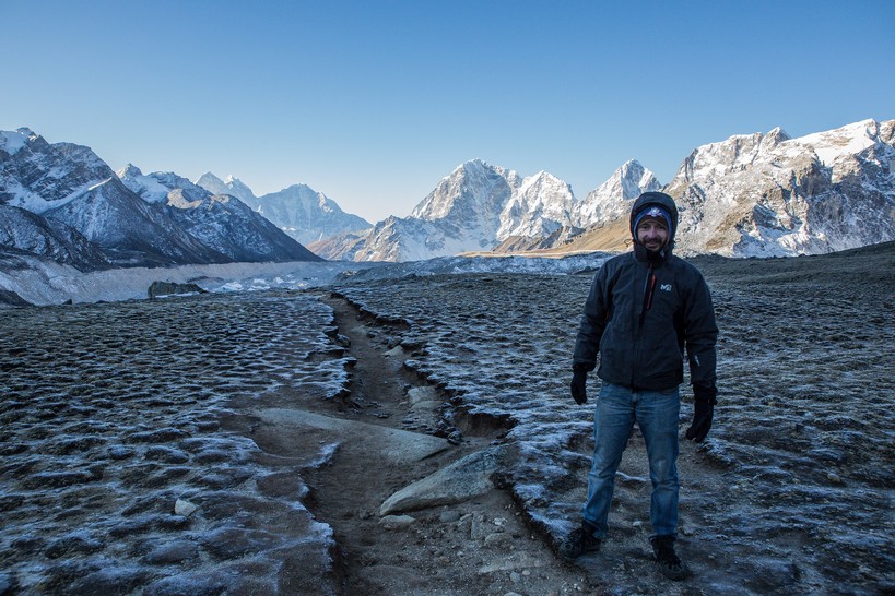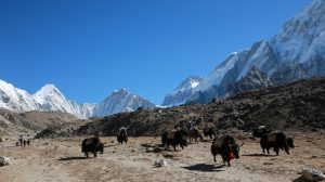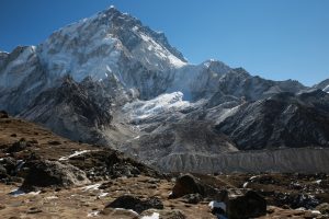On longe le glacier tout le long dans une marche presque plate et très agréable en comparaison de la veille. On se rapproche encore des grands sommets, c’est maintenant le Nupse (7500m) qui s’élève devant nous, il part à la verticale juste de l’autre côté du glacier, mais d’autres sommets tous aussi chouettes nous entourent. On croise encore des troupeaux de yaks (il n’y a pas beaucoup d’altitudes auxquelles ils ne vont pas !) et des trekkeurs qui reviennent de Kala Pattar. Parce que oui, arrivé à Gorak Shep on peut poser les sacs et le but ensuite est d’aller voir le camp de base certes, mais la rando la plus fameuse est la montée à l’aube à Kala Pattar, un petit sommet (la grande colline rouge sur les photos!) juste derrière les refuges à 5580m qui permet d’avoir une vue de malade sur toute la vallée et surtout sur le sommet de l’Everest (parce qu’on ne voit pas l’Everest depuis son camp de base !).