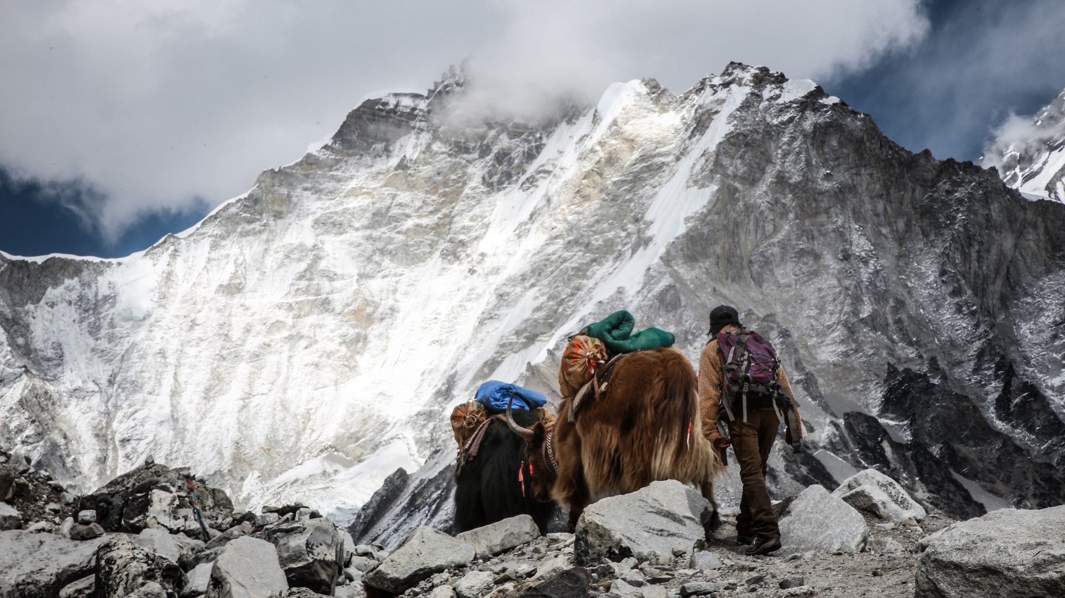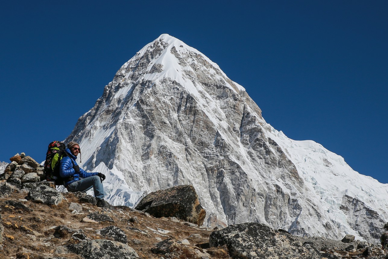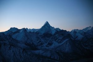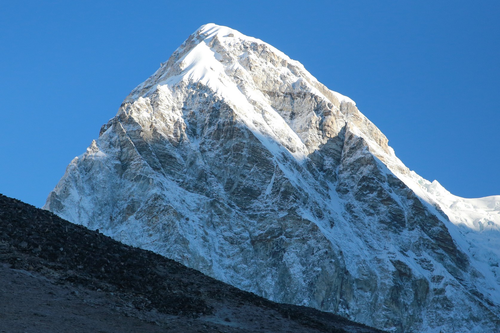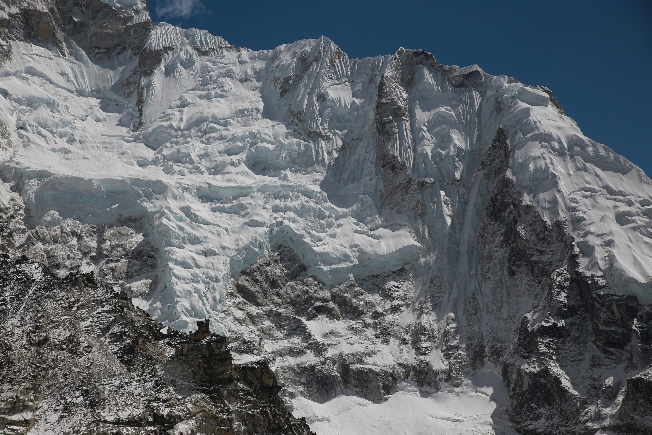 On longe le glacier tout le long dans une marche presque plate et très agréable en comparaison de la veille. On se rapproche encore des grands sommets, c’est maintenant le Nupse (7500m) qui s’élève devant nous, il part à la verticale juste de l’autre côté du glacier, mais d’autres sommets tous aussi chouettes nous entourent. On croise encore des troupeaux de yaks (il n’y a pas beaucoup d’altitudes auxquelles ils ne vont pas !) et des trekkeurs qui reviennent de Kala Pattar. Parce que oui, arrivé à Gorak Shep on peut poser les sacs et le but ensuite est d’aller voir le camp de base certes, mais la rando la plus fameuse est la montée à l’aube à Kala Pattar, un petit sommet (la grande colline rouge sur les photos!) juste derrière les refuges à 5580m qui permet d’avoir une vue de malade sur toute la vallée et surtout sur le sommet de l’Everest (parce qu’on ne voit pas l’Everest depuis son camp de base !).