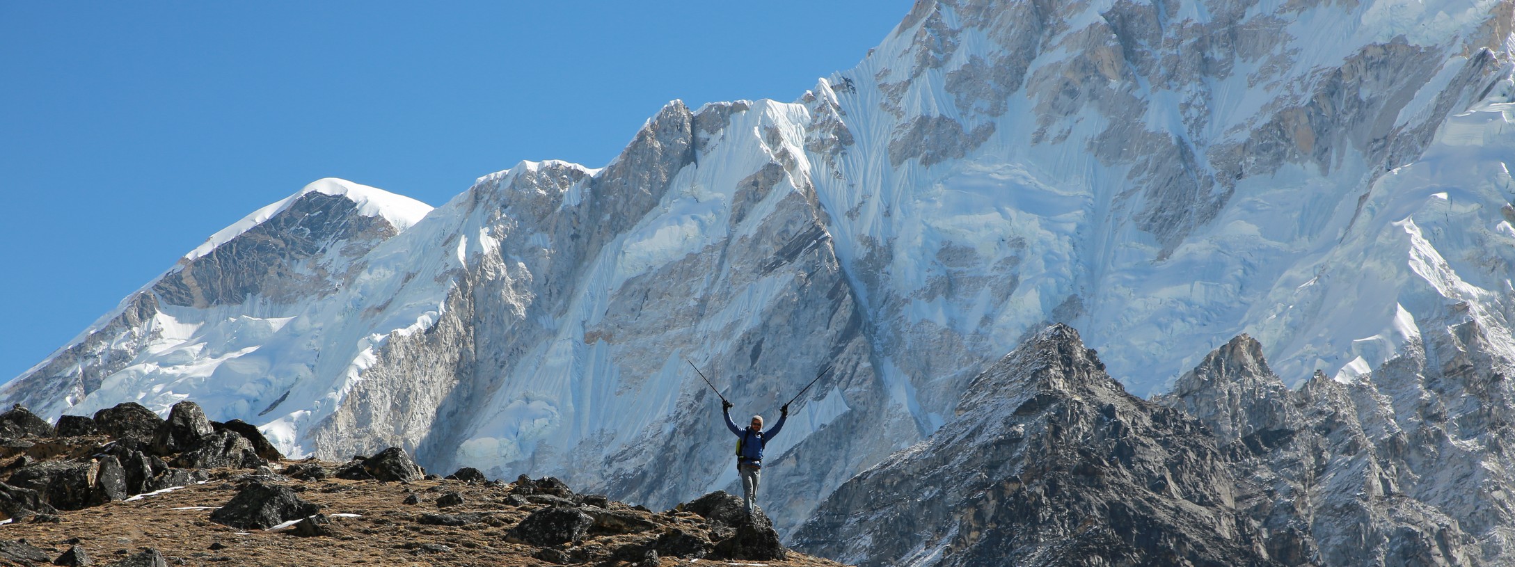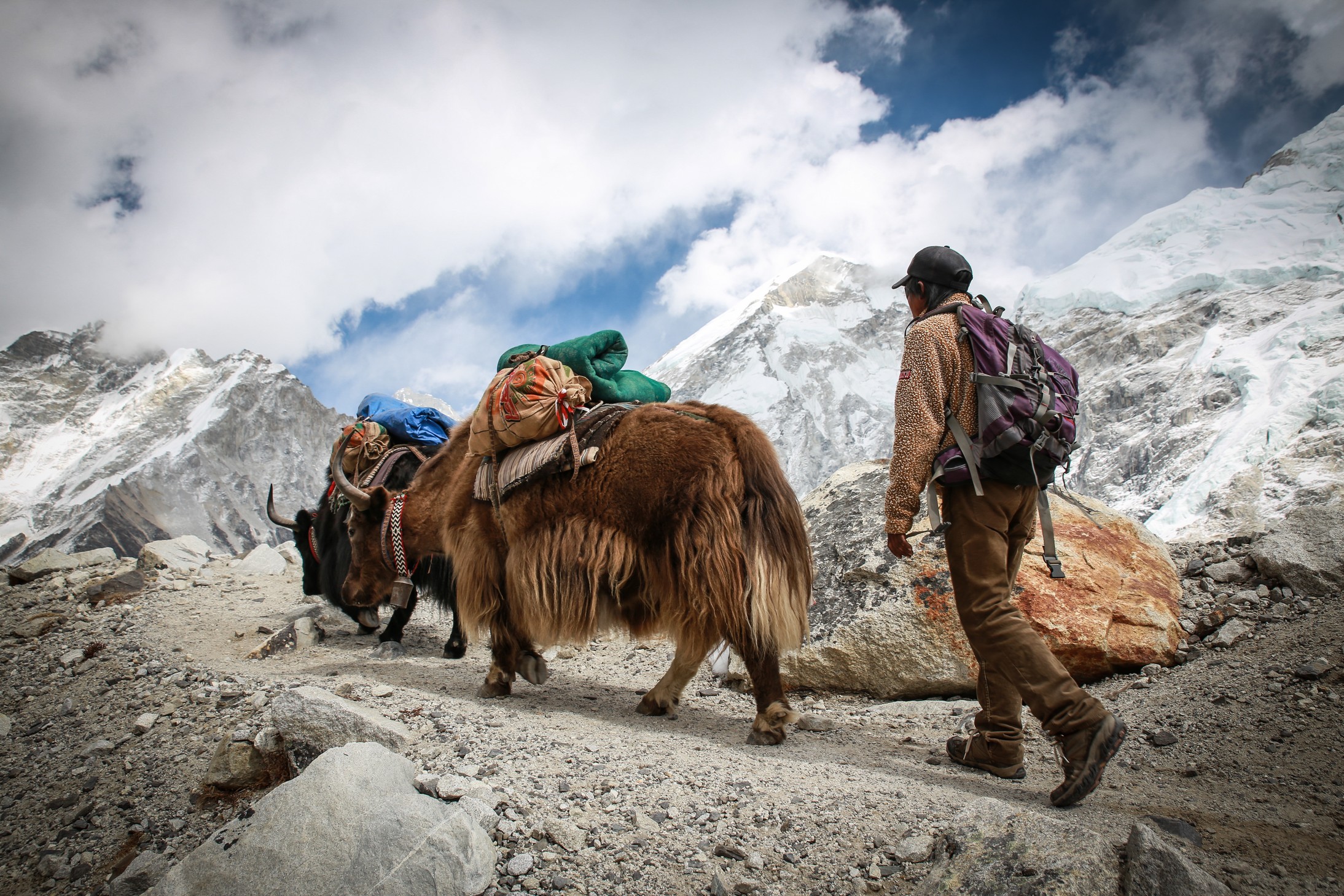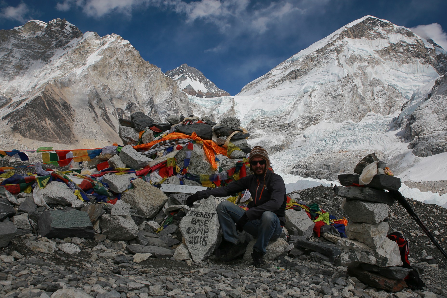 On longe le glacier tout le long dans une marche presque plate et très agréable en comparaison de la veille. On se rapproche encore des grands sommets, c’est maintenant le Nupse (7500m) qui s’élève devant nous, il part à la verticale juste de l’autre côté du glacier, mais d’autres sommets tous aussi chouettes nous entourent. On croise encore des troupeaux de yaks (il n’y a pas beaucoup d’altitudes auxquelles ils ne vont pas !) et des trekkeurs qui reviennent de Kala Pattar. Parce que oui, arrivé à Gorak Shep on peut poser les sacs et le but ensuite est d’aller voir le camp de base certes, mais la rando la plus fameuse est la montée à l’aube à Kala Pattar, un petit sommet (la grande colline rouge sur les photos!) juste derrière les refuges à 5580m qui permet d’avoir une vue de malade sur toute la vallée et surtout sur le sommet de l’Everest (parce qu’on ne voit pas l’Everest depuis son camp de base !).