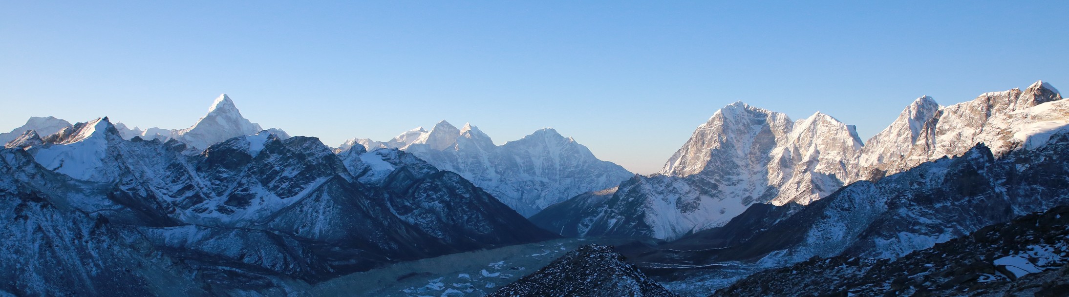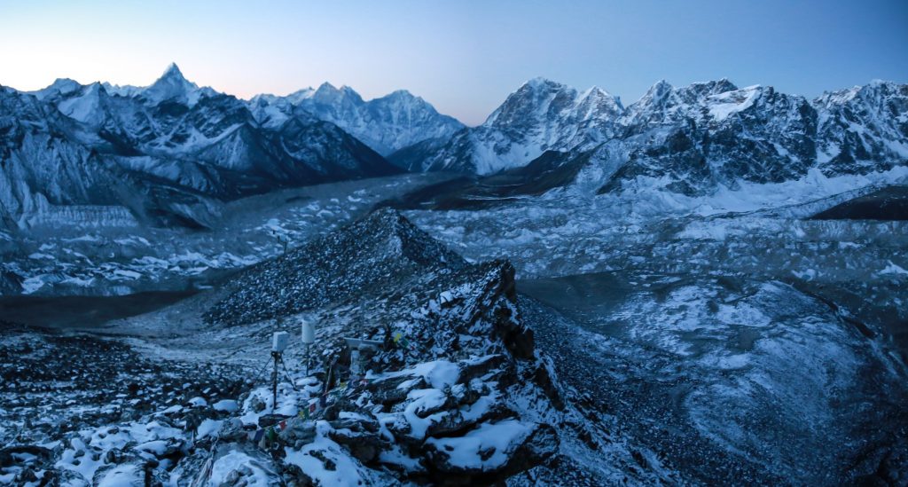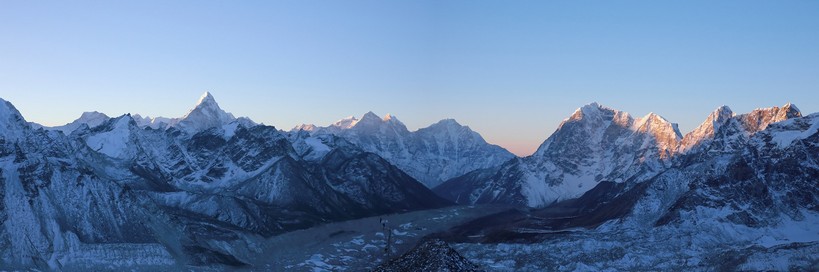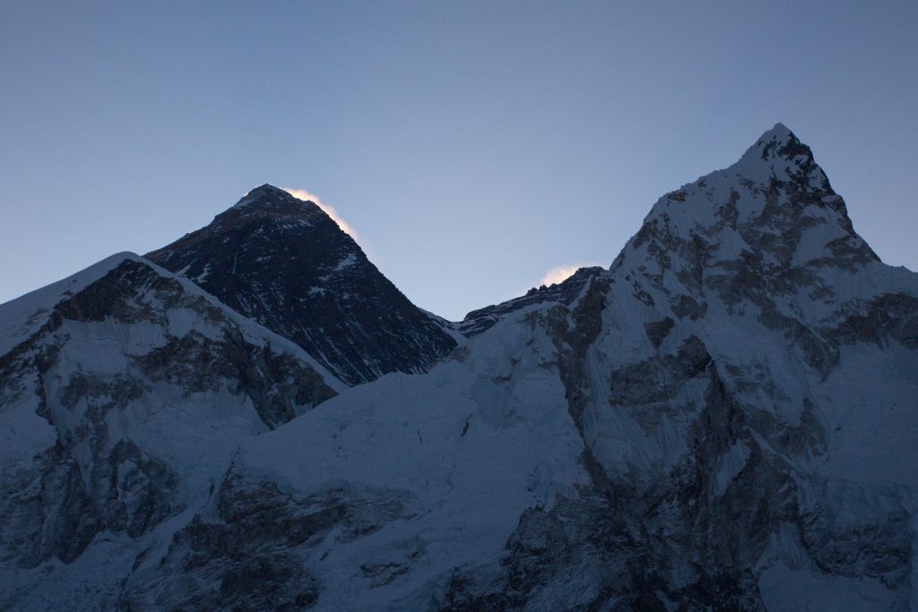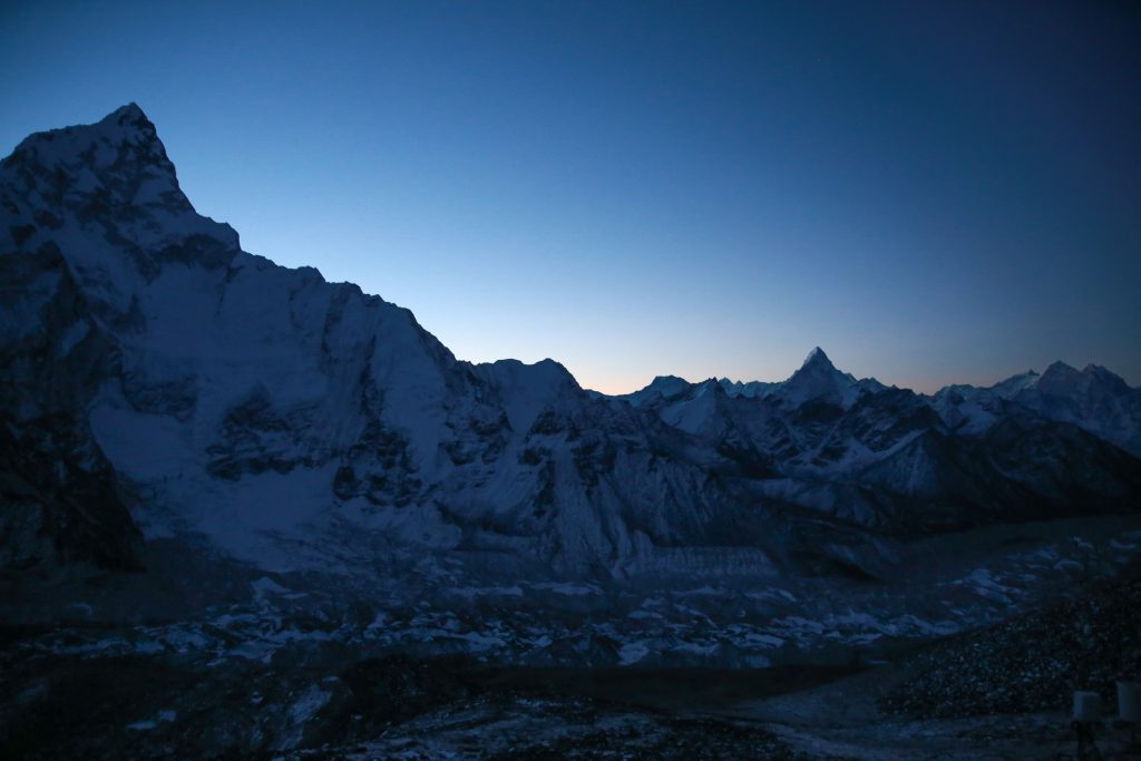Je suis le dernier à me mettre en route, j’ai entendu du bruit avant mais ils sont déjà partis. Je traverse le lac asséché et le retrouve face à la montée qui part à la vertical et trouve finalement le sentier, pas après pas, à vitesse minimale mais constante je monte, je n’ai pas trop chaud je suis bien, il fait -16. Je monte doucement en respirant fort, pas de pause, juste un pas devant l’autre. Bien plus haut je vois des frontales, finalement j’en rejoins une, un allemand de la veille, il arrête et va redescendre il a trop froid et n’est pas bien. Je continue ma route et au bout d’une heure et quart j’arrive en haut, Jakob le suédois est deja la, tout seul ! Je pensais qu’on serai bien plus mais peu de gens ont eu le courage ce matin, et l’autre allemand a dû se tromper de chemin ! Nous sommes donc monter bien plus vite que prévu et on doit attendre une heure là-haut par un froid mordant que le soleil commence à éclairer les premiers sommets ! L’Ama Dablam se détache toujours du reste mais paraît maintenant bien loin et petit ! Il faut dire qu’à 360 degrés on a rien à moins de 7000m quasiment, la vue est dingue, et là juste à gauche on voit enfin le sommet de l’Everest, leur papa à tous, 8880m, tu peux pas aller plus haut. Il paraît peu agréable et bien sombre à cette saison, austère. La prochaine fois il faudra aller le voir depuis le Tibet où la vue est beaucoup plus belle ! Enfin en étant là on comprend bien que pour ce trek, l’Everest n’est pas du tout le but mais c’est plutôt tout ce qu’il y a autours, à perte de vue !