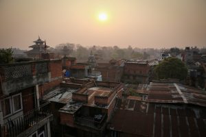 Le taxi n’en peut plus d’avancer au ralenti et on lui fait finalement signe de s’arrêter là, nous sommes quasiment arrivés au centre de Patan. On pose nos affaires au café de Patan, un des premiers hôtels construits ici, je n’avais pas osé me l’offrir la première fois. Outre le fait d’avoir une déco un peu française sur le déclin il a la particularité d’avoir une mini terrasse en roof-top au dessus des immeubles voisins.