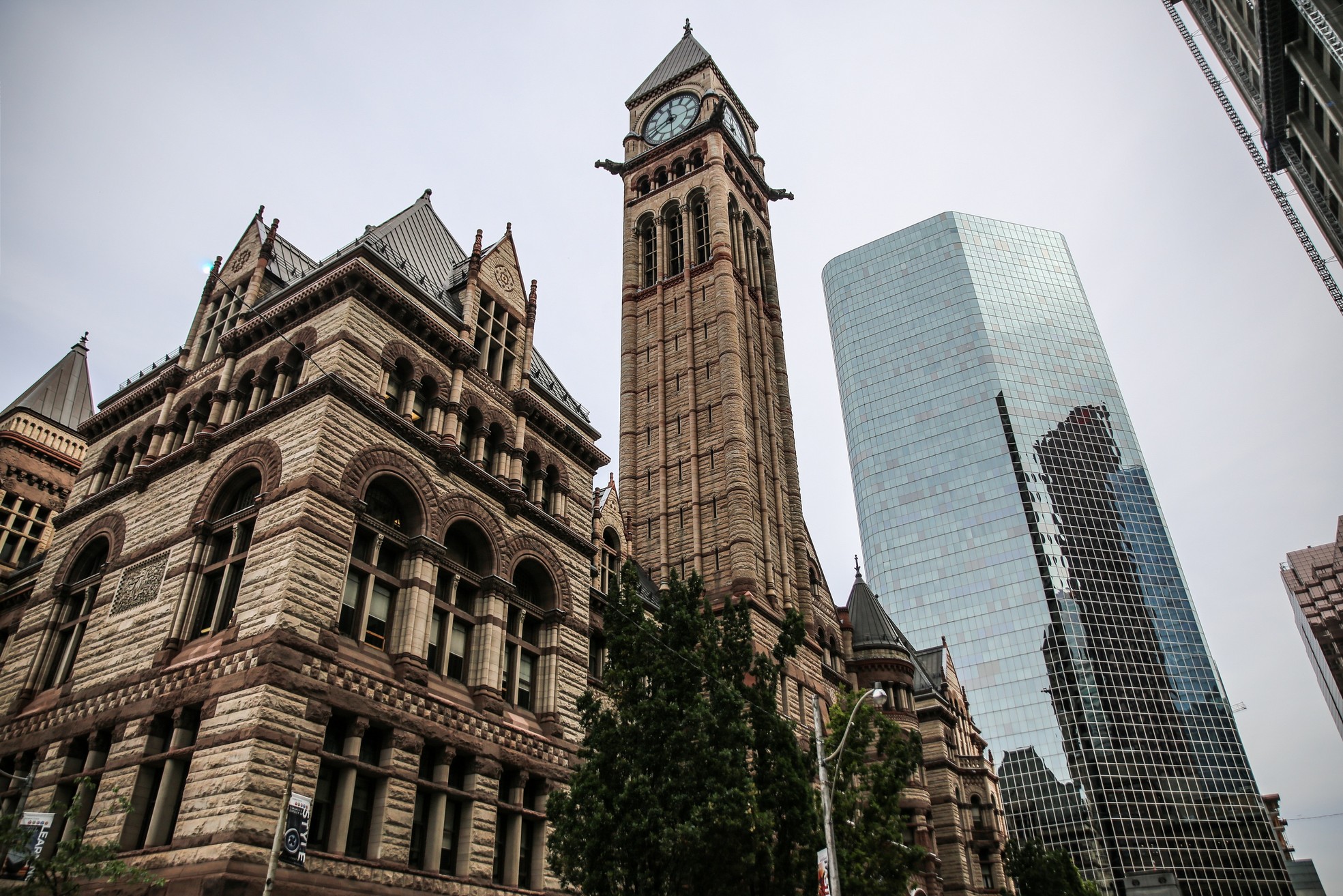 Après avoir difficilement garé le camping-car dans le centre ville (et devant une bouche d’incendie ce qui nous coûtera 100$ d’amende) on commence à déambuler. Direction downtown d’abord. Là, en plein milieu des grattes-ciels, TORONTO est écrit en toute lettre. Non ce n’est pas NYC mais on s’en rapproche, certes les buildings sont moins impressionnants mais on est clairement pas à Montréal… Beaucoup de contrates, l’hôtel de ville dénote particulièrement, souvent on retrouve une alternance de vieux immeubles au milieu de grattes-ciel vitrés.