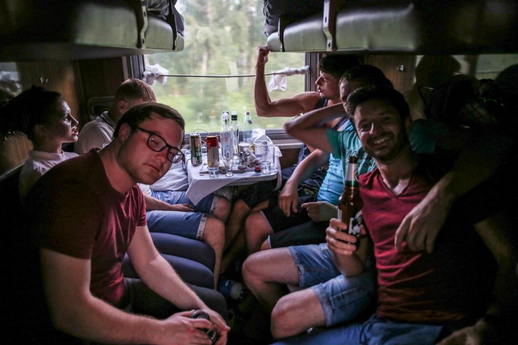 Le troisième soir (aprèm ?, on est un peu perdu entre l’heure de Moscou qui sert aux trains et l’heure réelle qui évolue chaque jour puisqu’on va vers l’est). Notre voisin de cabine déjà bien bourré nous invite à boire des shooters de vodka (russian tradition !) avec sa pote (et sa petite fille ?!), les allemands d’à côté nous viennent à l’aide, ca intrigue les russes d’encore à côté, bref, on est une dizaine au final dans un compartiment à tomber des bières et des shooters de tout ce qu’on trouve ! Jusqu’à ce que Panzer vienne pousser sa gueulante car officiellement il est interdit de boire de l’alcool en dehors du restaurant…