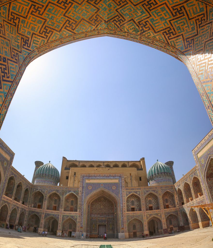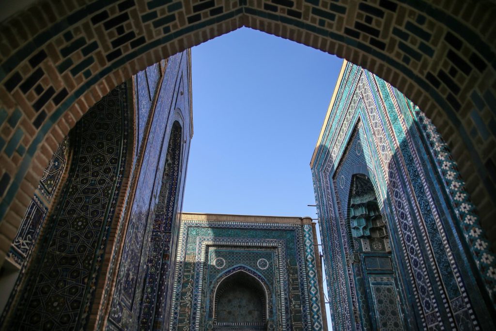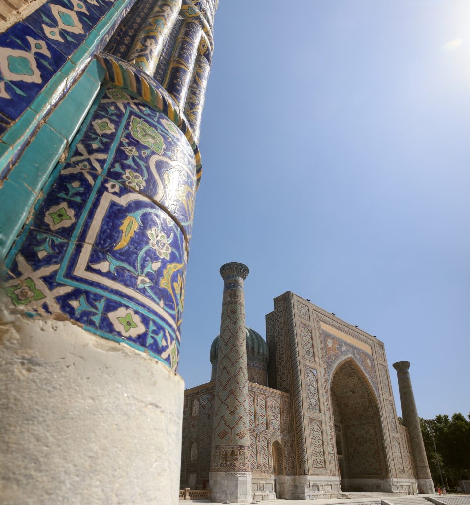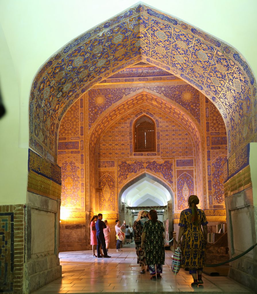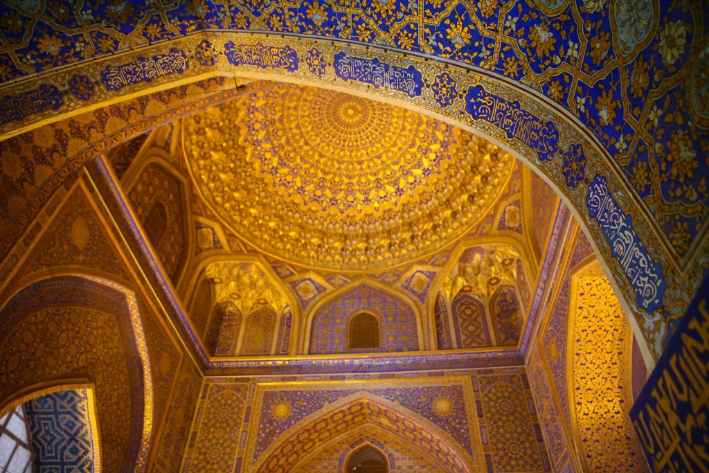 Ici les chambres sont plus chères, on dort pour 30$ la nuit, mais le petit déjeuner est dantesque. Rassasiés on part à l’assaut du Registan, cette place connue dans le monde entier comme étant le cœur de Samarcande, ces trois madrasas toutes en mosaïques bleues qui se font face depuis des siècles. Je marche dans un rêve tellement impressionné d’être enfin ici. Chaque bâtiment est plus beau que le précédent. Partout des petites pièces sombres, des plafonds peints à la main tellement détaillés qu’ils donnent le tournis. L’entrée de la madrasa centrale est décorée en feuilles d’or, les alcôves sont blanches.