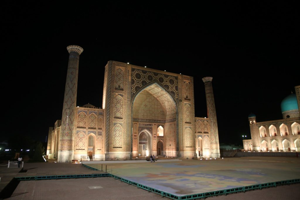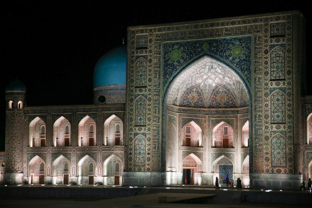 Le soir, les bâtiments sont éclairés ce qui donne une toute autre atmosphère à la ville. C’est presque encore plus beau car les couleurs ressortent mieux. On se promène dans un parc devant le mausolées de Timur (Timur c’est un peu la star nationale, celui qui a redonné à Samarcande toute sa grandeur) tout éclairé à l’extérieur mais fermé. Le garde s’approche de nous et nous dit que pour l’équivalent de 3€ il se fera un plaisir de rouvrir le bâtiment pour nous. On entre alors, la coupole est d’un bleu magnifique sur le fond noir profond, on pénètre dans le bâtiment, tout est noir, aucune lumière, alors le garde s’échappe un instant et soudain tous les projecteurs s’allument. On se retrouve tout seul au milieu du mausolée d’une splendeur absolue, le tombeau est au milieu de la coupole dont tout l’intérieur est peinture et sculpture, un moment magique difficile à bien photographier.