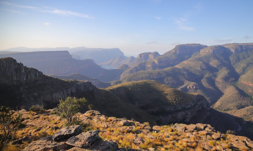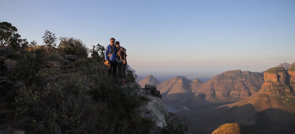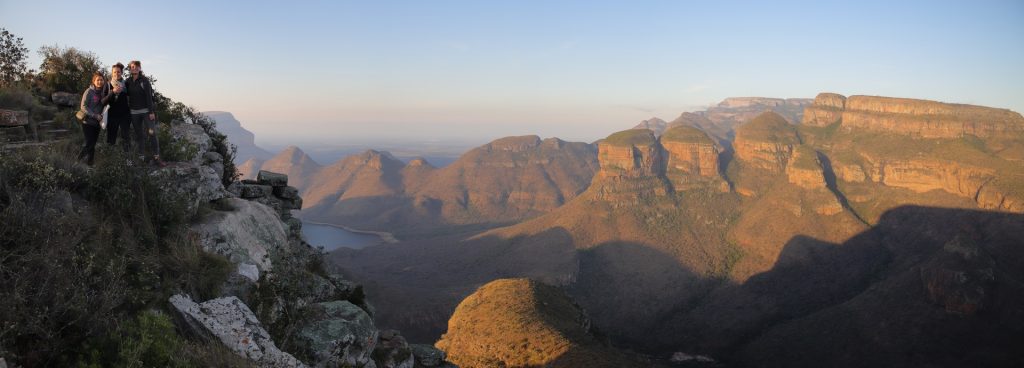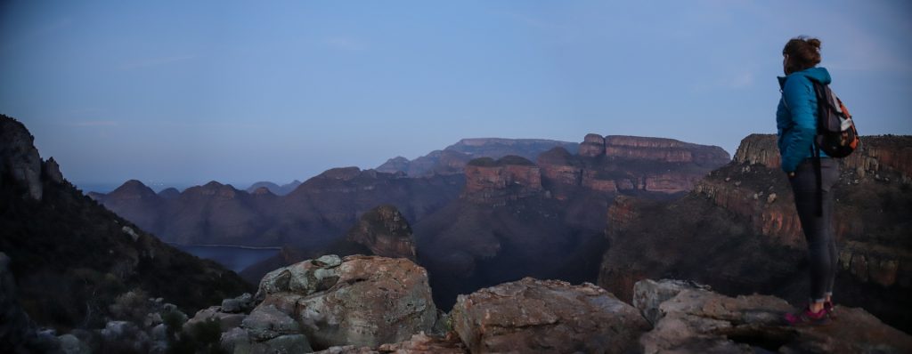 Le paysage est beau, nous sommes à environ 2000m d’altitude, le regard se porte loin et on devine finalement les « rondavels », ces petites montagnes rondes et pointues en forme de huttes de chaume typiques du pays. On gare la voiture juste avant le coucher du soleil, le guichet est déjà fermé, et on marche jusqu’au point de vue. Ici tout le canyon s’étale devant nous, la rivière au fond va former un lac qu’on devine un peu plus loin. La vue est magnifique, on circule au bord de la falaise, un long plateau fracturé net.