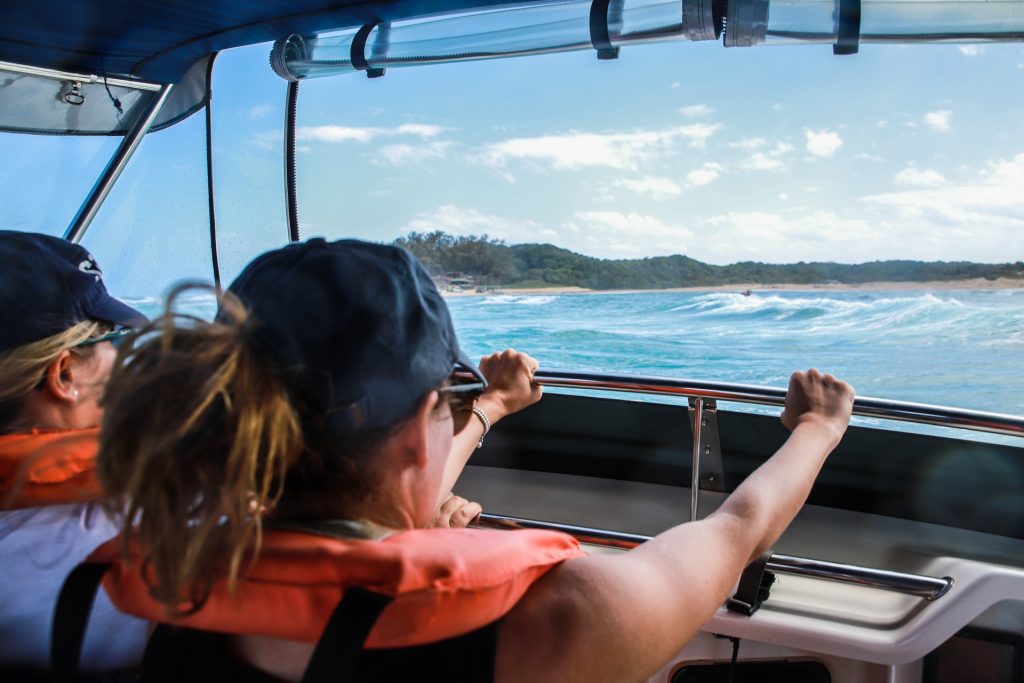 Mais finalement nous y sommes ! Sodwana, sous le Mozambique, côte est, bord d’océan indien. Au matin on part sur la plage, nous sommes en fait dans l’iSimangaliso Wetland Park. Gros rouleaux, kilomètres de sable fin, buvette sur la plage, on est bien. Notre bateau arrive car oui, on est pas venus là pour acheter du terrain mais pour voir les baleines à bosse !