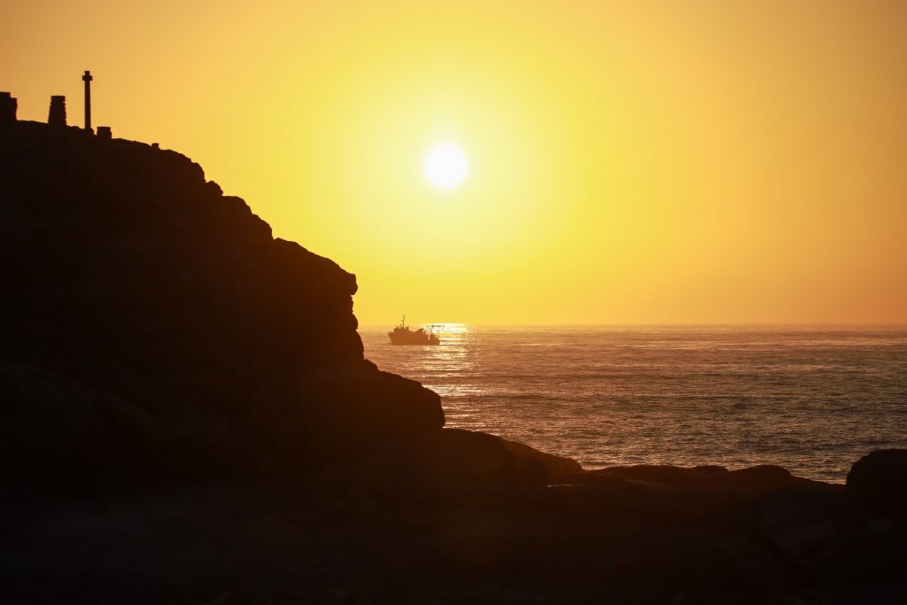 Route vers le nord puis complètement à l’ouest, direction l’océan. Ligne droite de 250km, désert. Au loin quelques semblant de montagnes, autours du nord une immensité de sable, du plat et un rouleau de bitume déroulé jusqu’à l’eau. On longe une ligne de chemin de fer qui n’a pas dû voir passer un train de bien longtemps. A intervalle régulier on découvre une petite gare à l’abandon.