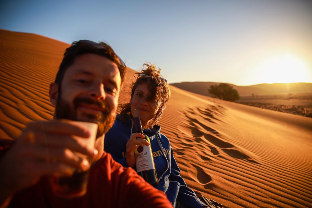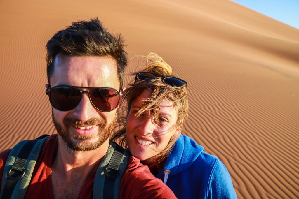On plante notre tente au Sesriem Camp, celui à l’intérieur du parc national. Oui ne faites pas l’erreur de payer un peu moins cher et d’être en-dehors, vous ne pourrez alors partir d’une heure après les autres au lever du soleil (donc vous le ratez) et devrez revenir une heure plus tôt (donc rater le sunset). Sois-disant toujours complets nous avons pû allègrement nous présenter de manière impromptue, notre réservation étant pour dans trois jours…