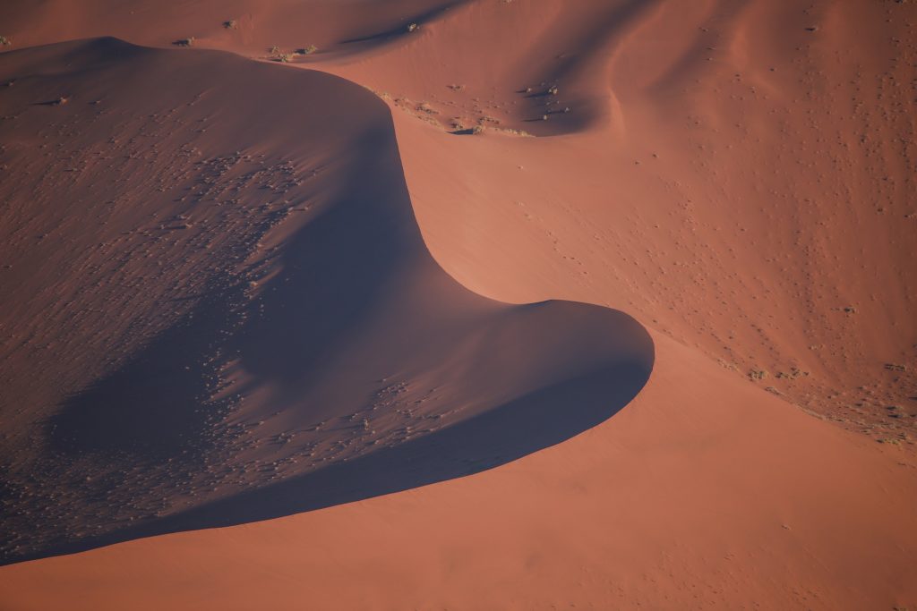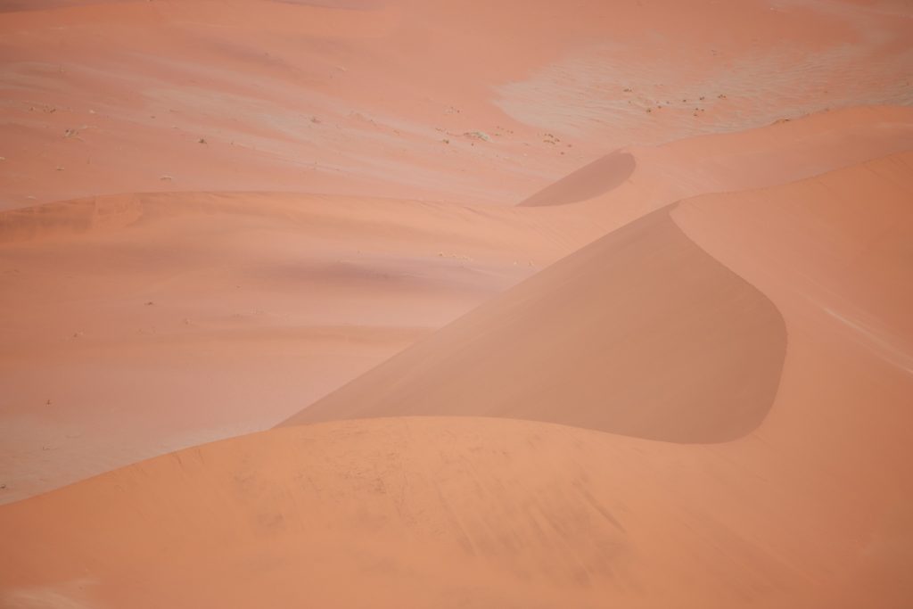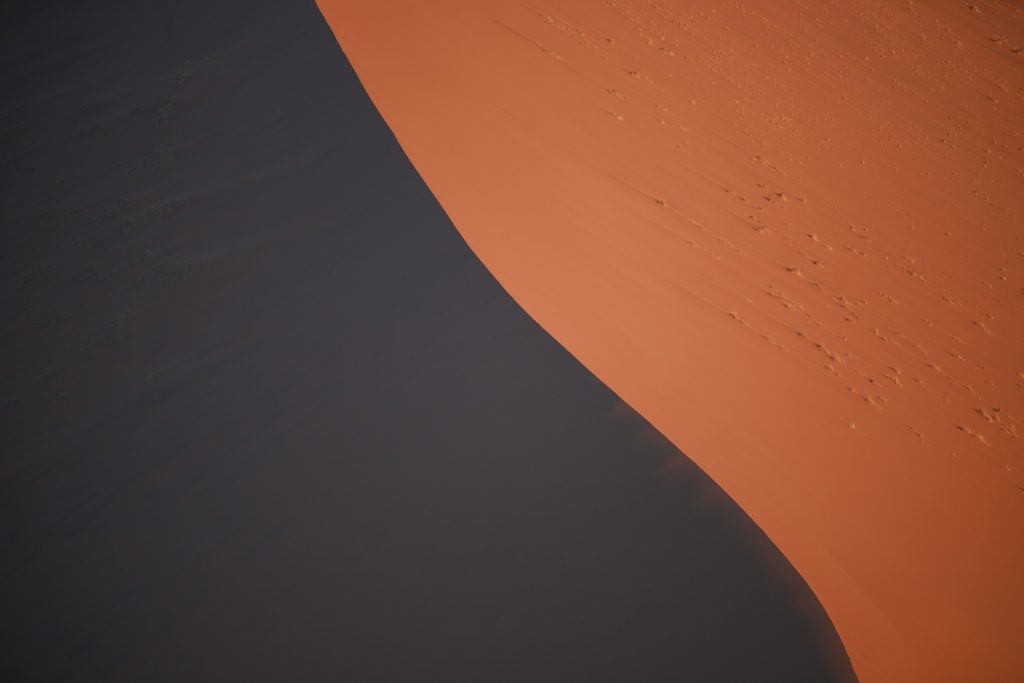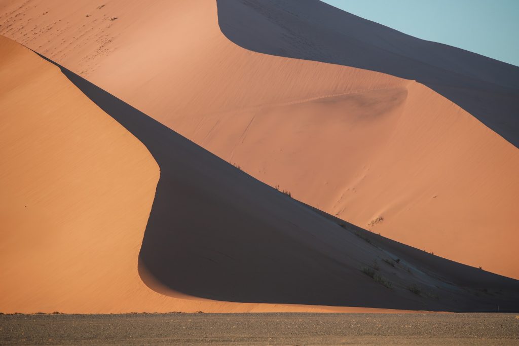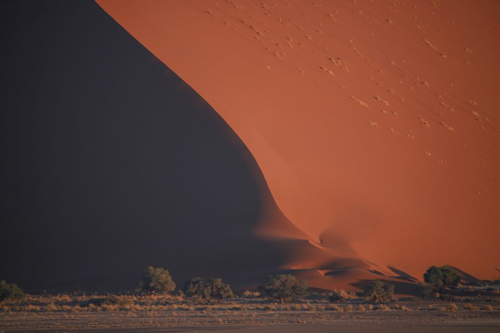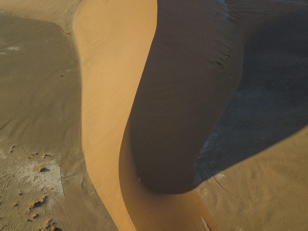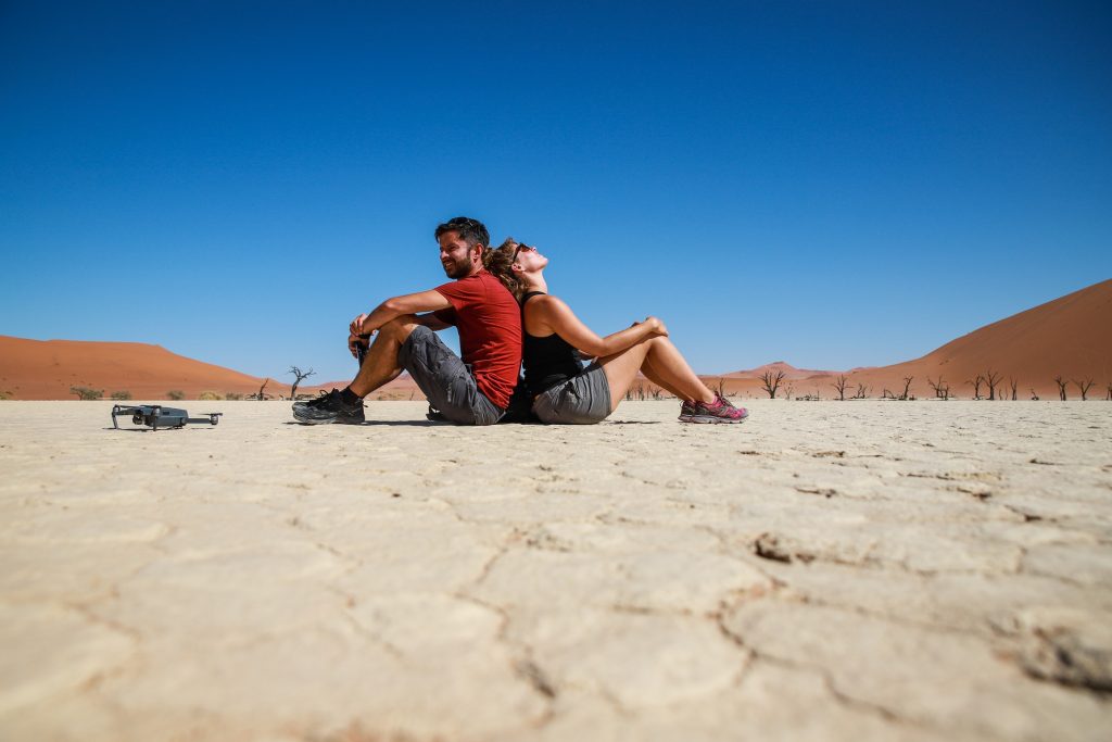 La route continue jusqu’au soixantième kilomètre. De là il faut un 4×4 pour continuer ou prendre la navette comme des loosers ce qu’on fait donc. Celle-ci pour un prix exhorbitant nous dépose 4km plus loin au parking des 4×4. Ici on continue à pied, 20mn d’abord vers Deadvlei, cette photo donc que vous connaissez, un lac séché qui a laissé une croûte blanchâtre où subsistent des cadavres d’arbres depuis 900ans, l’air étant trop sec pour qu’ils pourrissent. Le spectacle est magnifique, incroyable, c’est irréel, dingue, fou d’être ici. C’est grand, bien plus que ce que les photos laissent imaginer, les spectateurs déambulent au dans ce cimetière improbable, émerveillés. On s’assoit par terre, on pense, médite. Il fait une chaleur torride mais c’est pas grave, on est là. Le drone est interdit mais bon, qui va-t-on gêner, on est presque seul, d’ailleurs personne n’a rien vu ni entendu.