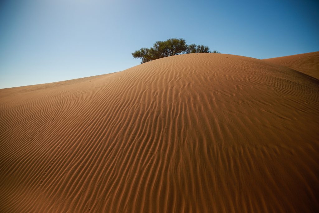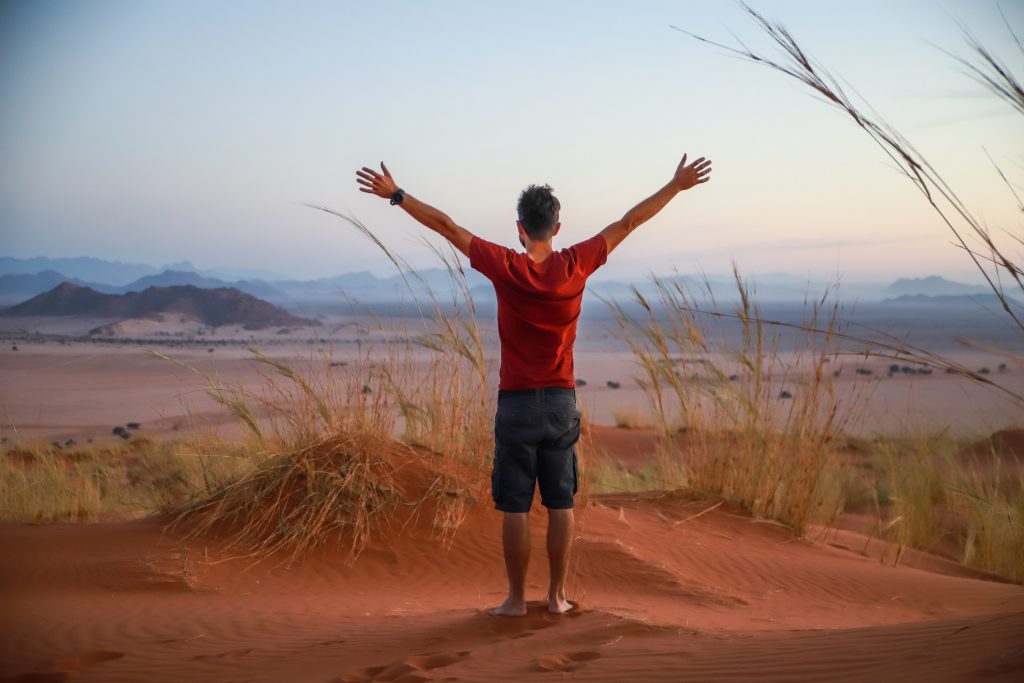 Le réveil sonne à 4h30 et à 5h15 une dizaine de voitures franchissent ensemble l’entrée intérieure du parc. A partir de là c’est 60km de route toute droite au milieu des dunes rouges. Pourtant pas tellement d’options, la dune recommandée pour le lever du soleil est la dune 45 qu’on atteint après justement 45km, nous sommes dans les premiers et alors que le sable est encore tout froid on attaque la montée. Dur d’aller jusqu’en haut alors quand le spot nous plait, on s’arrête, assis sur une arrête avec une petite centaine de mètre de pente en sable sous nos tongs. Le soleil se lève en face, éclaire nos tronches ravies et progressivement les pentes faces à nous, joyeux anniversaire Rémi !