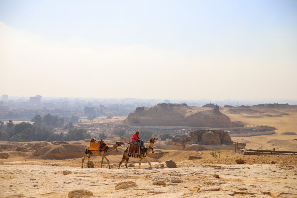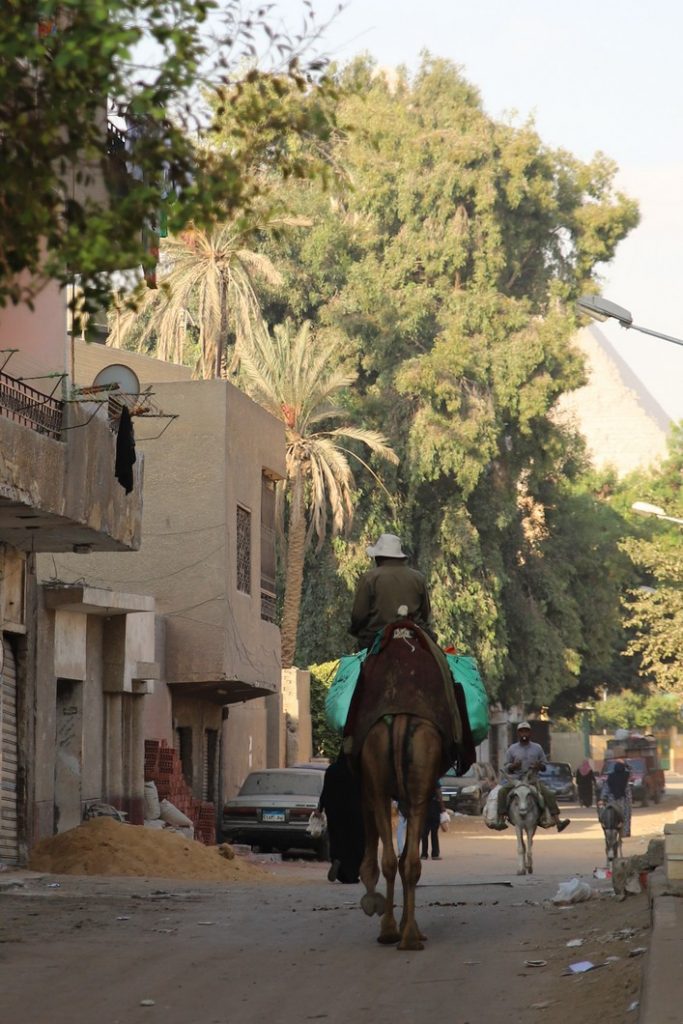 On arrive bien trop tôt à Gizeh, l’occasion de boire le café dans le quartier des pyramides alors qu’il se réveille doucement. On les voit déjà qui dépassent derrière les immeubles c’est impressionnant !